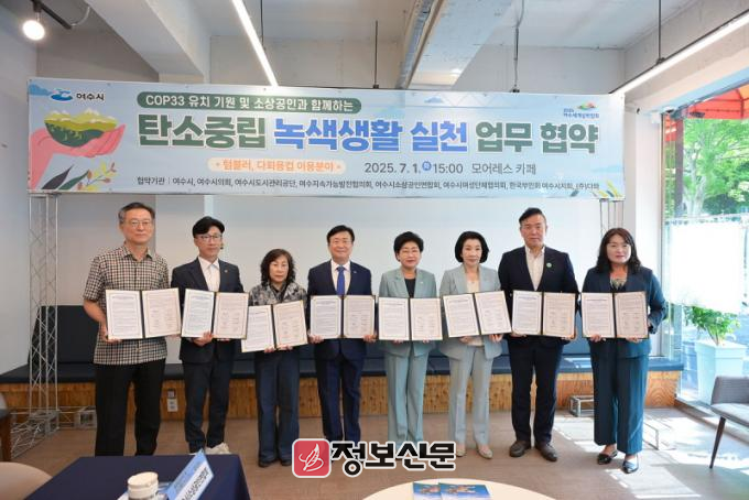 ![]() 여수시(시장 정기명)는 지난 1일 제33차 유엔기후변화협약 당사국총회(COP33) 유치를 위해 7개 기관·단체와 ‘탄소중립 녹색생활 실천 업무협약’을 체결했다. |