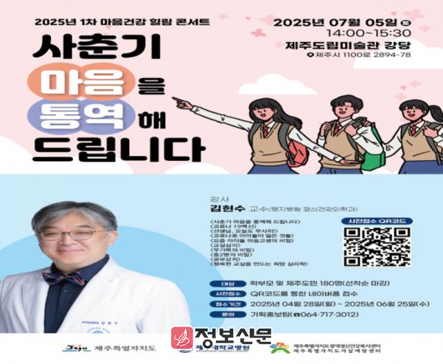 행사는 사전 접수한 학부모 및 제주도민 180명을 대상으로 진행되며, 행사 당일 시작 10분전부터는 현장접수도 가능해 보다 많은 도민이 참여할 수 있도록 운영할 계획이다. 이번 콘서트를 통해 요즘 아이들의 진짜 속마음을 들여다보고, 가정 내 사춘기 자녀와의 긍정적인 의사소통 및 관계 개선을 위한 시간을 가질 예정이다.