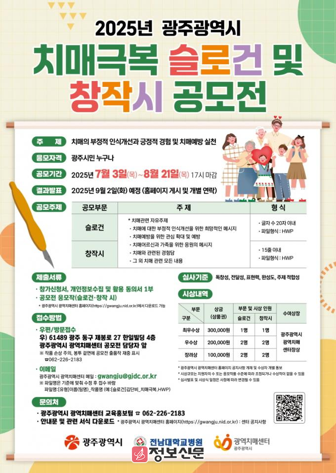 공모 결과는 오는 9월2일 광주시치매센터 홈페이지를 통해 발표된다. 시상은 9월18일 ‘치매극복의 날 기념행사’에서 진행된다.