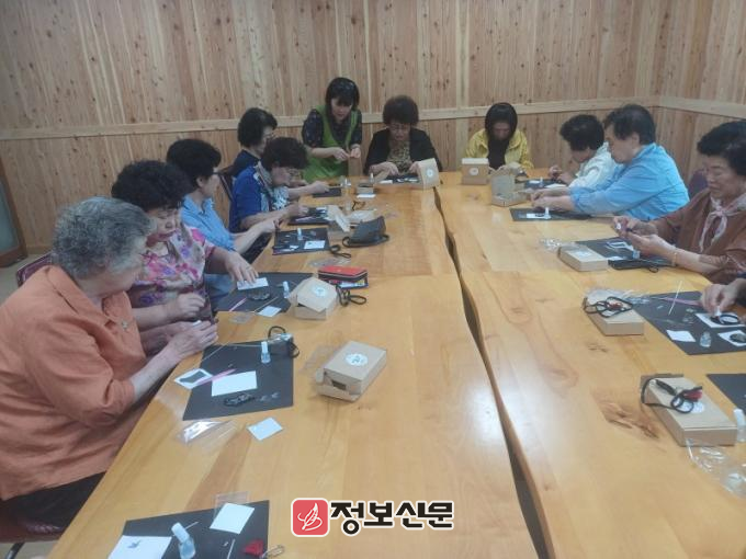 ![]() 여수 미평주공아파트 입주민들이 우리노리협동조합에서 제공한 ‘자개 공예 만들기’ 체험을 하고 있다. |