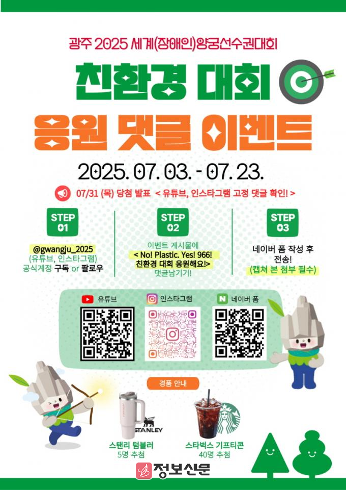 이번 이벤트는 대회 공식 사회관계망(SNS) 계정(유튜브 및 인스타그램 @gwangju_2025)을 통해 ‘친환경 대회 응원 댓글 달기’로 진행된다. 참여 방법은 대회 공식 계정을 구독(또는 팔로우)하고, 이벤트 게시물에 응원 댓글을 작성한 후 네이버 폼에 제출하면 된다. 이벤트 참여자 중 추첨을 통해 텀블러와 커피쿠폰을 증정한다.