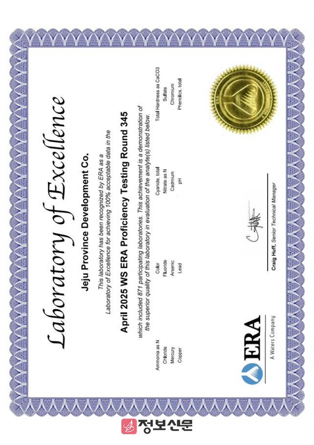 제주개발공사는 중금속류 6종, 음이온류 4종, 일반 항목 7종 등 먹는 물 분야 등 총 17개 항목에서 '만족(satisfactory)' 판정을 받았다.평가 방법은 미지 시료에 대한 측정 기관의 시험 분석 능력을 만족, 주의, 불만족 3단계로 검증한다.
