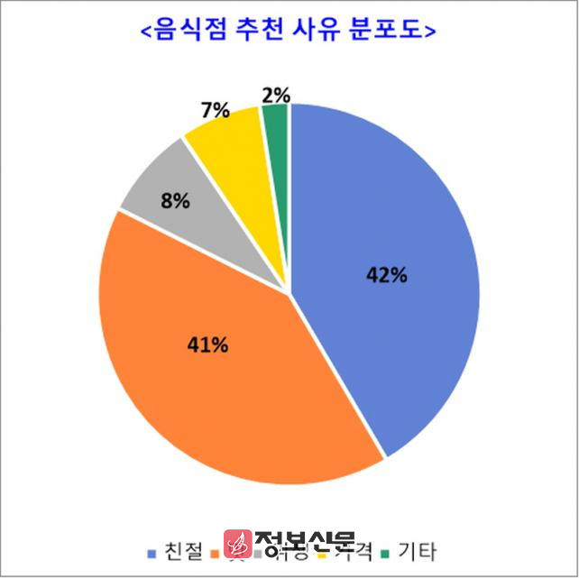 한편, 이벤트에 접수된 추천 사유를 분석한 결과 ▲‘친절’이 42%로 가장 높은 비중을 차지했으며, 이어서 ▲‘맛’ 41%, ▲‘위생’ 8%, ▲‘가격’ 7%, ▲‘기타’ 2% 순으로 나타났다. 이는 시민들이 단순히 음식의 맛을 넘어 정성과 배려가 담긴 친절한 서비스에 감동을 받고 있음을 보여주는 결과로 풀이된다.