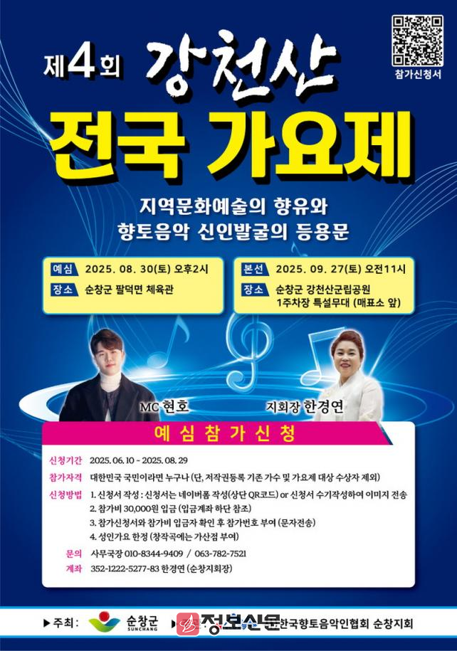 올해로 4회째를 맞는 이번 가요제는 순창군이 주최하고,(사)한국향토음악인협회 순창지회(지회장 한경연)가 주관하는 전국 규모의 음악 축제로, 지역 문화예술을 널리 알리고, 신인 발굴을 목표로 마련됐다.
