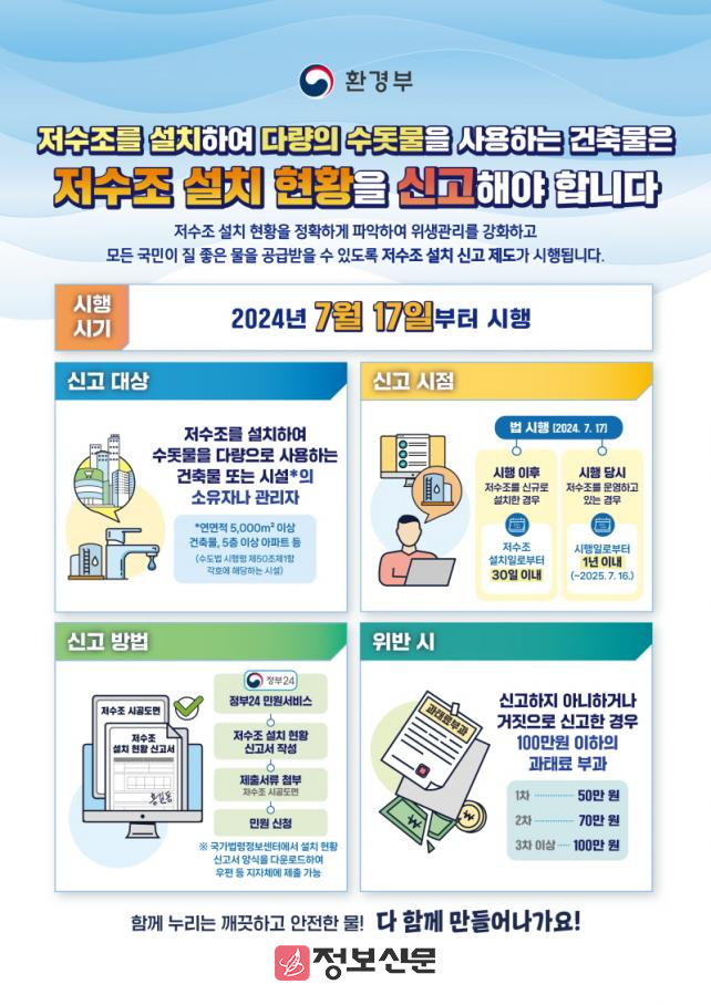 안재완 물관리과장은 “저수조 설치 현황 신고제도는 관내 저수조 시설 현황을 정확히 파악해 수돗물 위생 관리의 투명성과 신뢰성을 높이기 위한 중요한 조치이다”며 “신고 대상이 되는 건축물 및 시설 소유자와 관리자는 관련 절차를 준수해 기한 내 반드시 신고해 달라”고 말했다.