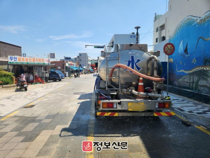 무안군은 민간 살수차량을 활용하여 무안읍, 남악, 오룡 일대 총연장 20㎞ 구간에 일 5회 도심 살수작업을 추진하고 있으며, 폭염특보 발령 시 오전 10시부터 오후 5시까지 물 뿌리기 작업을 실시해 효과를 높이고 있다.