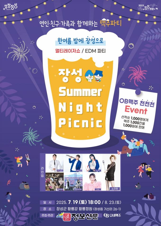 한편, ‘장성의 중심’ 황룡강도 더위에 지친 사람들을 위한 선물을 준비했다. 이달 19일 오후 6시 황룡정원 야외무대에서 ‘장성 썸머나잇 피크닉’이 열린다. 폭발적인 가창력을 지닌 가수 소찬휘를 필두로 더위에 지친 사람들에게 활력소가 될 음악을 들려준다. 선착순 1000명에게 맥주 1000잔을 1000원에 판매하는 행사도 연다.