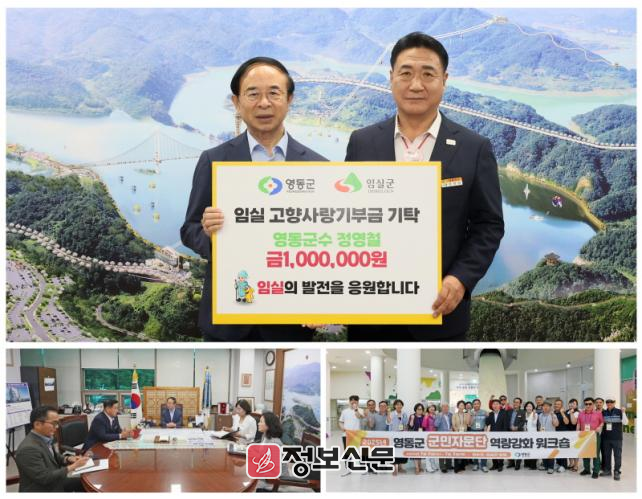 임실군과 자매결연을 맺은 충북 영동군 정영철 군수는 지난 3일 심 민 임실군수를 찾아 지속적인 우호 협력관계 강화와 활발한 문화교류를 함께 하는 데 뜻을 같이하고 상호 간의 신뢰와 우정을 재확인했다. 특히, 정 군수는 이날 임실군에 고향사랑기부금 100만원을 기탁 하며, 남다른 임실 사랑을 보였다.