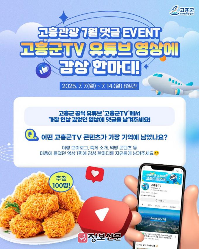 이번 이벤트는 고흥군 공식 관광 SNS 활성화와 온라인 소통 강화를 위해 마련됐으며, 참여자 중 총 100명을 추첨해 치킨 세트를 증정한다.