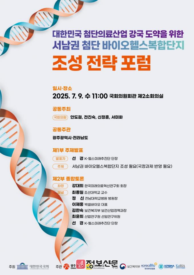 광주광역시(시장 강기정)는 9일 오전 11시 서울 여의도 국회의원회관 제2소회의실에서 ‘서남권 첨단 바이오헬스복합단지 조성전략 포럼’을 개최한다고 7일 밝혔다.