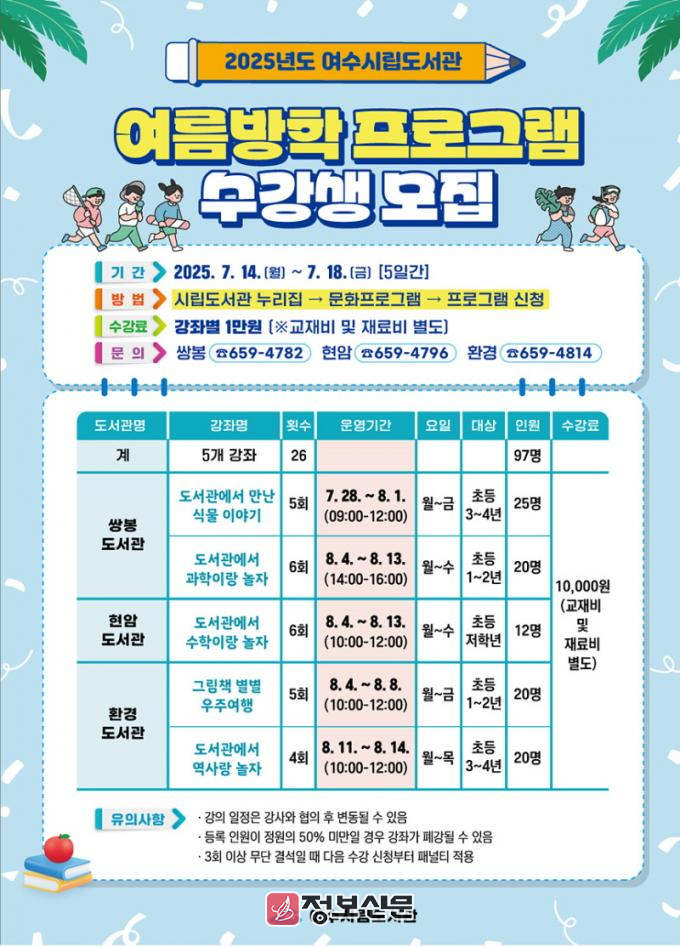 ![]() 여수시립도서관, 여름방학 프로그램 수강생 모집 |