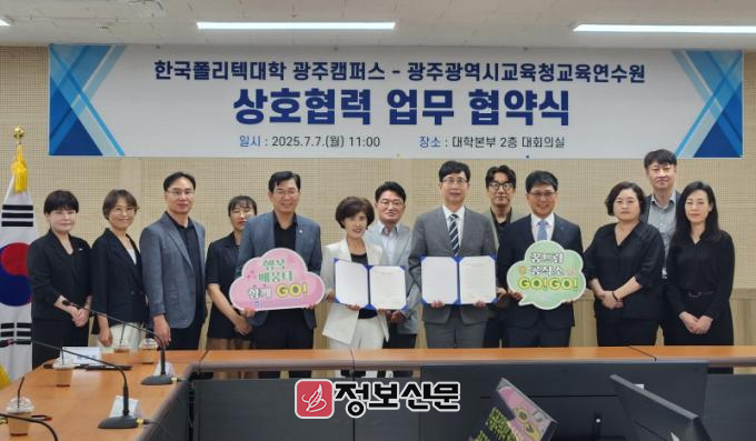 교육연수원 노경희 원장과 폴리텍대학 광주캠퍼스 배규환 학장 직무대리는 7일 폴리텍대학 광주캠퍼스 대학본부 대회의실에서 ‘교직원 진로지도 역량 강화를 위한 업무협약’을 체결했다.