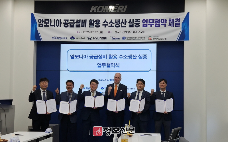 전북자치도와 군산시는 7일 군산시 오식도동에 위치한 한국조선해양기자재연구원에서 한국조선해양기자재연구원, 현대자동차, 현대로템, 방재시험연구원과 함께 '암모니아를 활용한 수소생산 시스템 구축'을 위한 업무협약(MOU)을 체결했다.