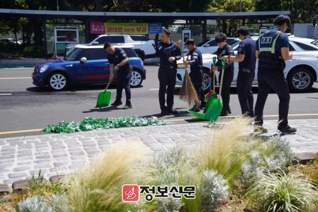 사고를 목격한 도청 청원경찰들은 곧바로 빗자루와 쓰레받이를 들고 현장에 출동해 도로에 흩어진 병 조각과 상자를 신속히 수거했다. 현장 정리는 약 20분 만에 마무리됐으며, 오전 11시 10분경 차량 통행은 정상화됐다.