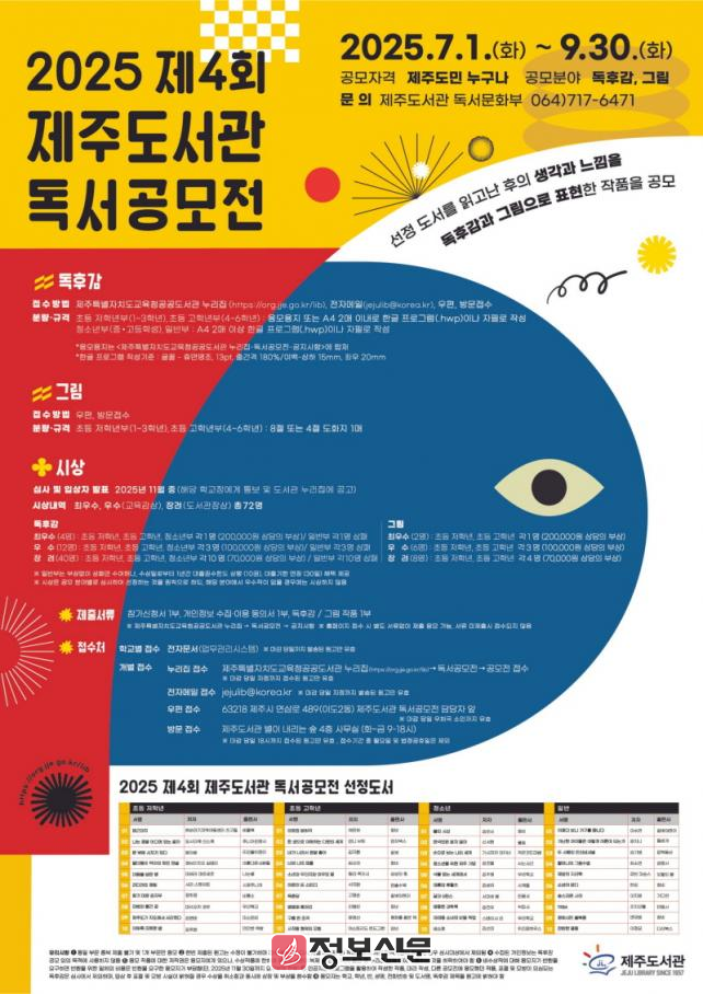 ![]() 제주도서관, 오는 9월 30일까지 제4회 독서공모전 접수 |
