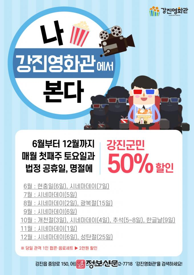 ‘강진 영화보는 날’은 강진군민을 대상으로 영화 관람료 50% 할인 혜택을 제공하는 상설 행사로, 매월 첫째주 토요일과 법정 공휴일·명절에 강진영화관에서 운영된다. 여기에 매점 팝콘·음료세트 2천원 할인 등이 더해지며 지역민들의 문화 향유 기회를 넓히고 있다.