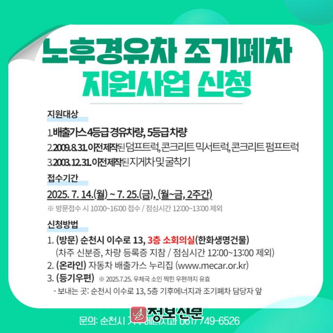 ![]() 순천시, 2025년 조기폐차 보조사업 14일부터 접수 |