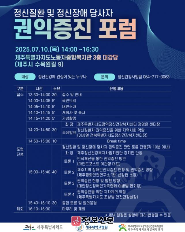 ![]() 제주도광역정신건강복지센터, 정신질환 및 정신장애 당사자 권익증진 포럼 개최 |