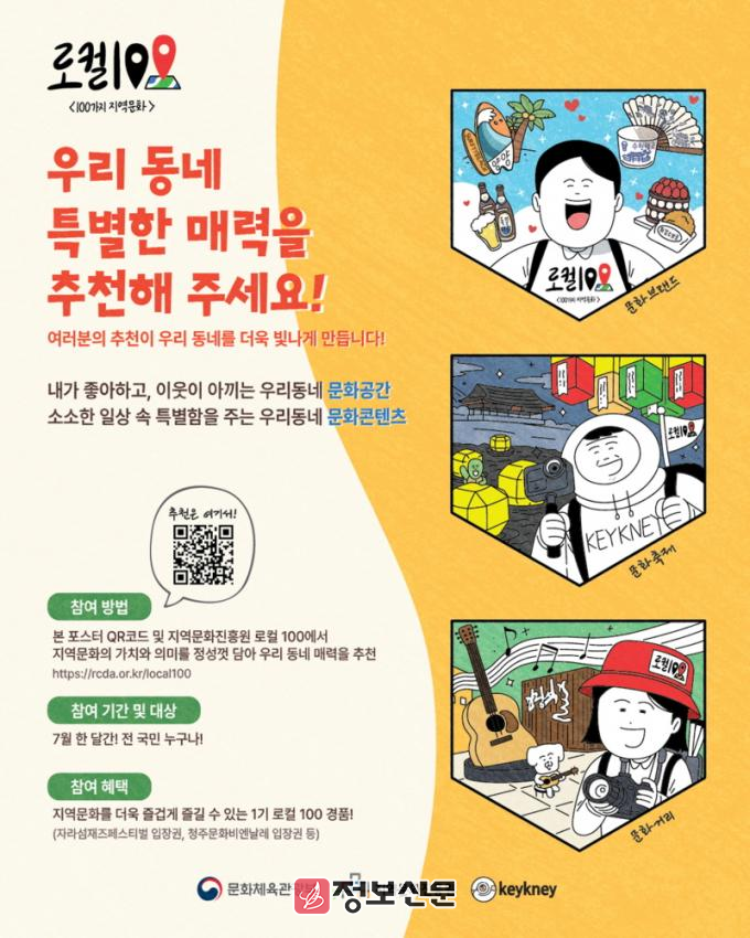 추천 대상은 복합문화공간, 전통시장 등 지역에 기반을 둔 특색 있는 문화자원과 축제, 공연, 체험형 콘텐츠, 지역 브랜드 등의 문화콘텐츠다. 추천은 7월 31일까지 공식 누리집(https://rcda.or.kr/local100) 또는 홍보 포스터의 QR코드를 통해 가능하며, 참여자에게는 추첨을 통해 삼성 갤럭시 탭 S10 FE, 갤럭시 워치 7, 지역축제 및 비엔날레 관람권, 아이스아메리카노 등 다양한 경품이 제공된다.