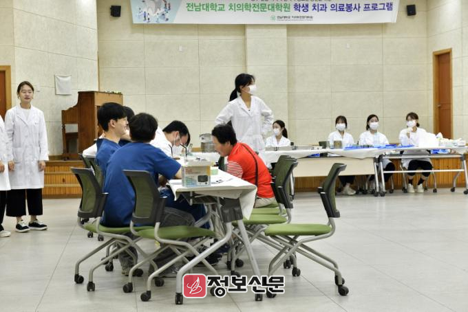 고서면 문예회관에서 이뤄진 이날 봉사에는 전남대 치전원생 40여 명이 참여해 고서면 어르신과 주민 40여 명에게 스케일링(치석 제거), 구강검진, 레진 충전, 의치 세척 및 관리 교육 등 다양한 치과 진료 서비스를 제공했다.