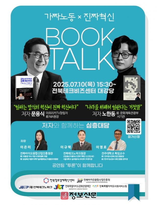 전북특별자치도문화관광재단(대표이사 이경윤, 이하 재단), 전북바이오융합산업진흥원(원장 이은미), 전북테크노파크(원장 이규택), 전북창조경제혁신센터(대표이사 강영재), 전북특별자치도사회서비스원(원장 서양열) 5개 기관은 오는 7월 10일(목) 오후 3시 30분, 전북테크비즈센터 1층 대강당에서 ‘가짜노동 × 진짜혁신 BOOK TALK’를 공동 개최한다.