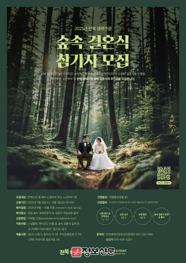 ![]() 전북특별자치도, 전북 생태관광 숲속 결혼식’ 참가자 모집 |