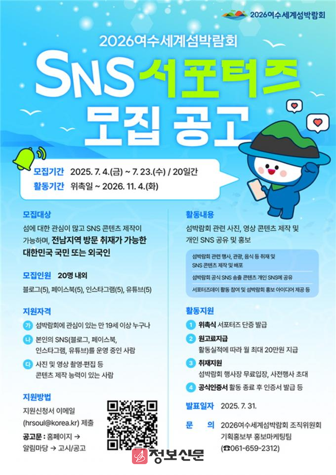 ![]() (재)2026여수세계섬박람회 조직위원회, 섬과 사람을 잇다 섬박람회 SNS 서포터즈 모집 |