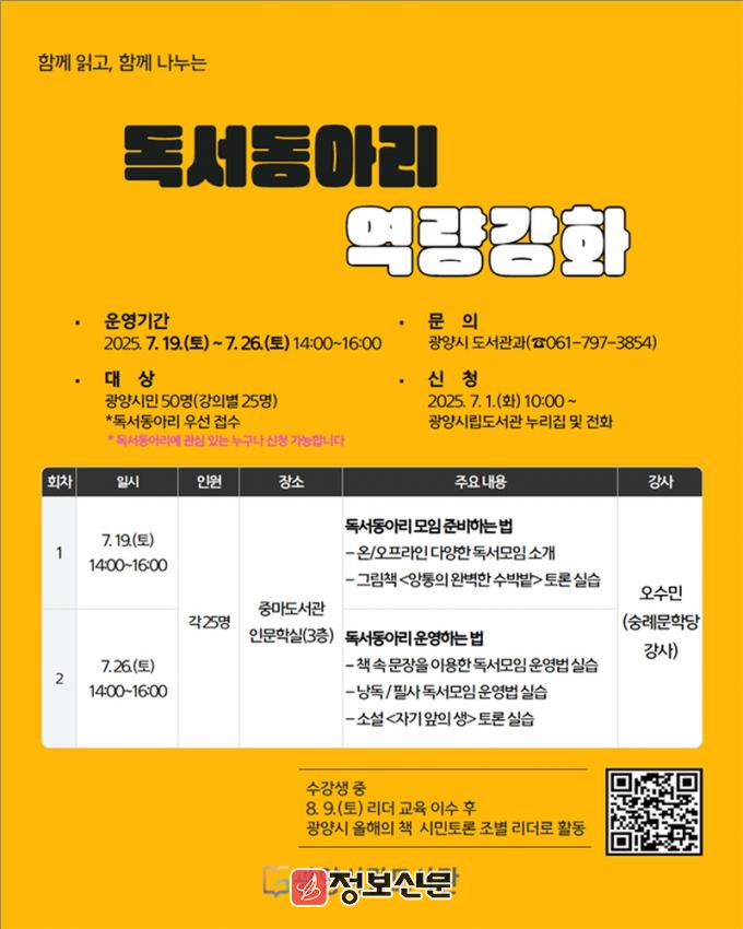 모집인원은 총 25명이며, 독서동아리 대표와 회원을 우선으로 선착순 모집한다. 운영에 관심 있는 시민들 또한 참여할 수 있으며, 신청은 광양시립도서관 누리집 또는 도서관지원팀(☎061-797-3854)을 통해 가능하다.