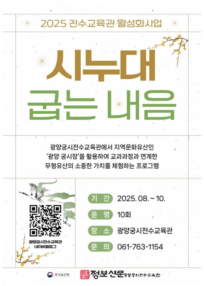 이 프로그램은 국가유산청이 주최하고 광양궁시전수교육관이 주관하는 ‘2025 전수교육관 활성화 사업’의 일환으로 추진된다. 본 사업은 무형문화유산 전수교육관을 지역 문화의 중심 거점으로 육성하고, 전통문화의 전승 기반을 강화하기 위한 공모사업이다.