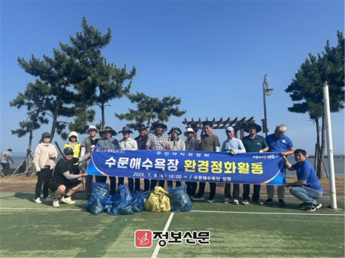 수문해수욕장 환경정화 활동에는 위원 25명이 참여하여 해변 일대의 쓰레기를 수거하고, 주변 시설을 정비하는 등 쾌적한 관광 환경조성을 위해 구슬땀을 흘렸다.