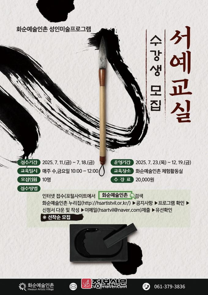 ![]() 화순예술인촌, 서예교실 2강좌 수강생 모집 |