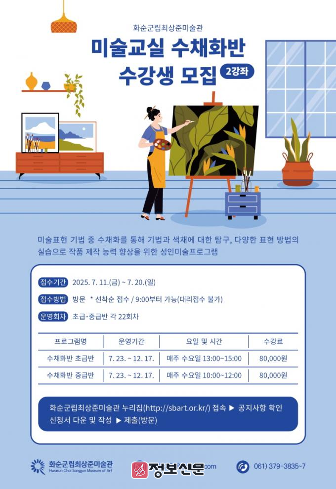 ![]() 화순군, ‘미술교실 수채화반’ 2강좌 수강생 모집 |