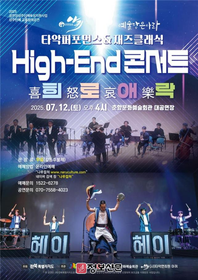 이번 공연은 타악 퍼포먼스와 재즈·클래식으로 구성된 ‘High-End 콘서트: 喜怒哀樂(희로애락)’으로, 오는 7월 12일 오후 4시에 남원 춘향문화예술회관 대공연장에서 진행되며 전석 무료로 운영된다.