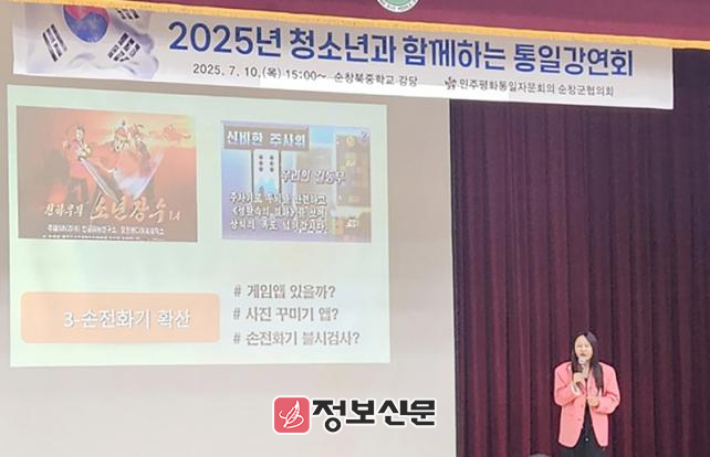 이번 강연회는 청소년들의 통일에 대한 관심과 이해를 높이고 평화의 가치를 함께 공유하기 위해 마련된 자리로, 순창북중학교 강두희 교장을 비롯한 교직원과 전교생 150여 명이 참석한 가운데 진행됐다.