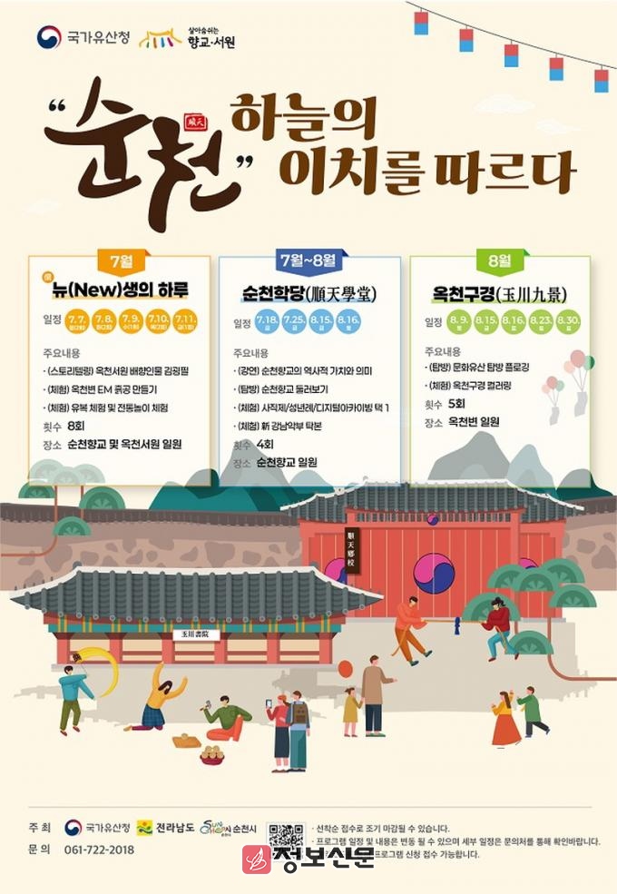 이번 프로그램은 ‘순천, 하늘의 이치를 따르다’라는 주제로, ▲순천학당 ▲ 뉴(New)생의 하루 ▲옥천구경 등 총 3가지 테마로 구성돼 시민들이 직접 보고, 듣고, 체험하며 유산의 가치를 느낄 수 있도록 기획됐다.