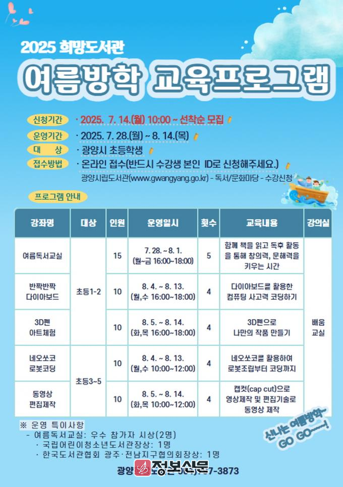 한편, 광양희망도서관은 국립어린이청소년도서관이 주관하는 「제111회 전국 공공도서관 독서교실」과 연계해 ‘여름 독서교실’도 함께 운영한다. 본 프로그램은 선정 도서를 읽고 토론하는 방식으로 진행되며, 적극적으로 참여한 우수 학생 2명에게는 국립어린이청소년도서관장상과 한국도서관협회 광주·전남지구협의회장상이 각각 수여될 예정이다.