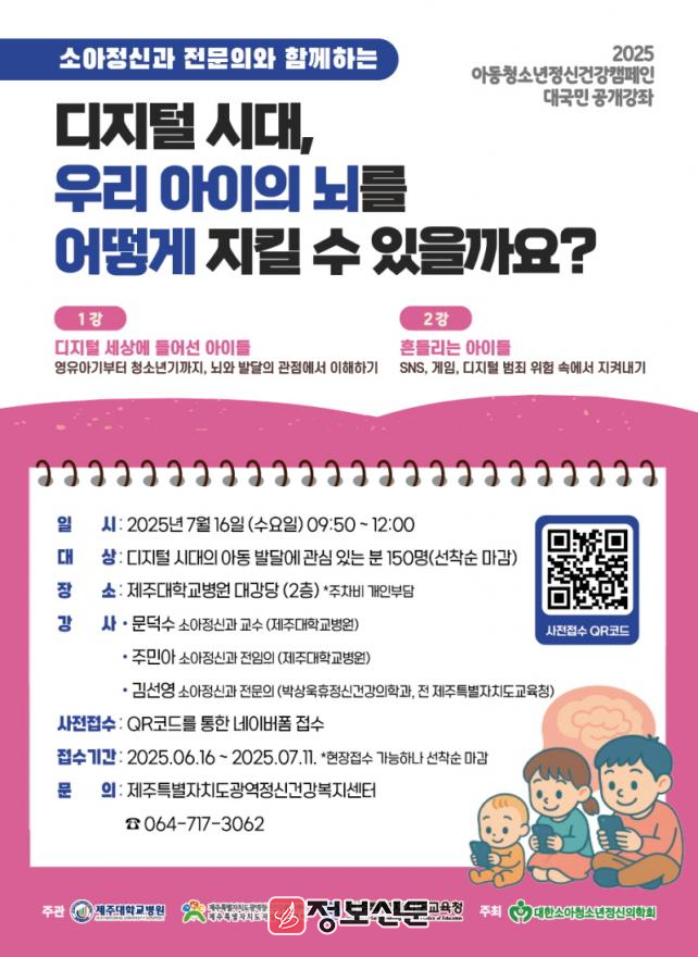이번 공개강좌는 제주특별자치도교육청, 제주대학교병원과 공동 주관하며, 정신건강 분야의 소아청소년 전문가들이 디지털 환경 속에서 자녀의 뇌 발달을 건강하게 지키기 위한 과학적이고 실천적인 정보를 제공할 예정이다