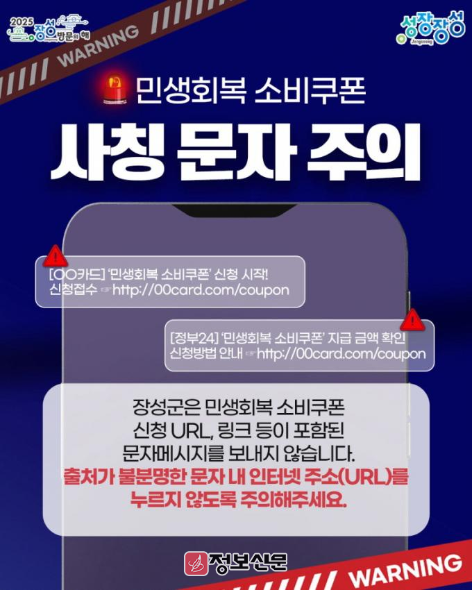 장성군 관계자는 “장성군은 민생회복 소비쿠폰에 관한 인터넷주소, 링크 등이 포함된 안내 문자 메시지를 절대 발송하지 않는다”면서 “쿠폰 안내를 빙자해 출처가 불분명한 인터넷주소(URL), 링크 등을 문자로 받았다면 즉시 지울 것”을 권장했다.