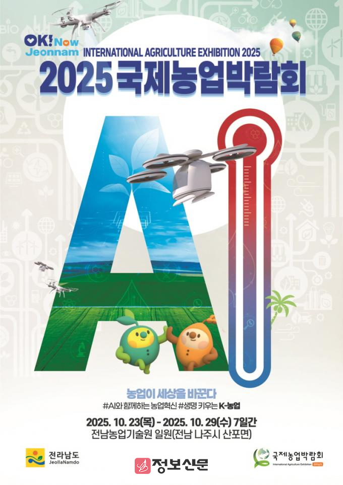 2025국제농업박람회는 오는 10월 23일부터 29일까지 나주 산포면 전남도농업기술원 일원에서 개최된다. ‘AI와 함께하는 농업혁신, 생명 키우는 K-농업’를 주제로 미래 농업의 비전과 혁신 기술을 선보일 예정이다.