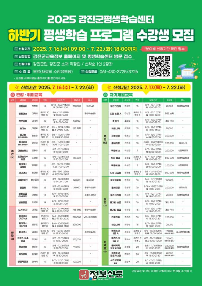 ![]() 강진군, 2025년 하반기 평생학습 수강생 모집 |