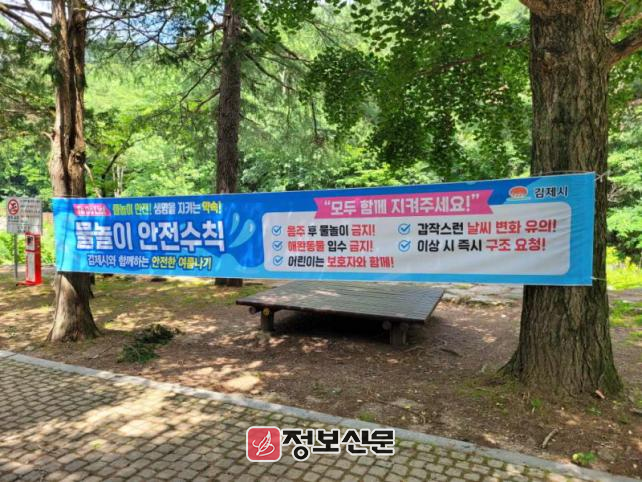 김제시는 물놀이 관리지역을 지난 3월 기반 시설, 수질 등을 고려해 당초 관리지역(금산천 하류 금평저수지 인근)에서 신규 관리지역(금산천 상류 금산사 내부 계곡)으로 변경 지정하고, 당초 관리지역에서 물놀이를 금지시킨 바 있다.