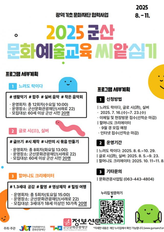 군산문화관광재단 관계자는 “2025년 군산 문화예술교육 씨-앝(art) 심기 프로그램에 어르신들의 많은 관심과 참여를 바라며, 이번 기회를 통해 문화예술교육을 경험하고 삶의 활력을 얻기를 기대한다.”라고 전했다.