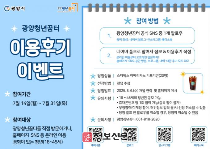 ![]() 광양청년꿈터, ‘이용 후기 이벤트’ 진행 |
