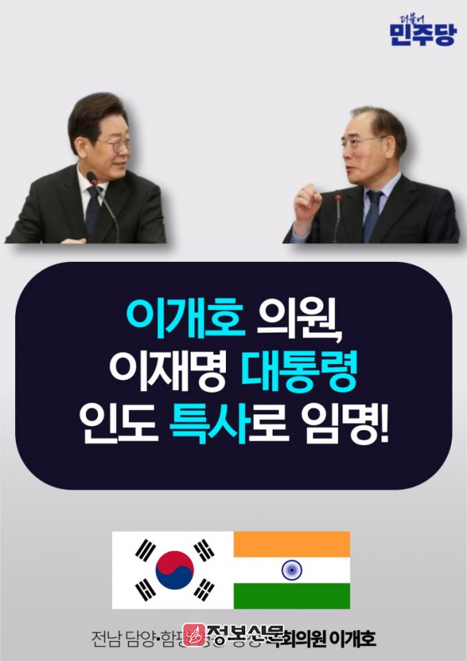 이번 인도 특사단은 김부겸 전 총리를 단장으로 이개호 의원과 송순호 선대위 공동위원장 등이 함께 방문하게 된다. 대통령 특사는 대통령이 신뢰도가 높은 인물을 파견한다는 점에서 이번 이개호 의원의 인도 특사 발탁 배경에 관심이 모아지고 있다.
