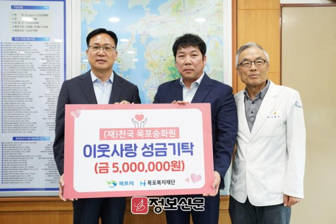 이날 성금 전달식에는 목포시장 권한대행 조석훈 부시장, 자치행정복지국장, 노인장애인과장을 비롯해 재단법인 천국 고원식 이사와 세화산업사 원용태 상무이사, 목포복지재단 강철수 이사장 등 관계자 7명이 참석해 뜻깊은 자리를 함께했다.