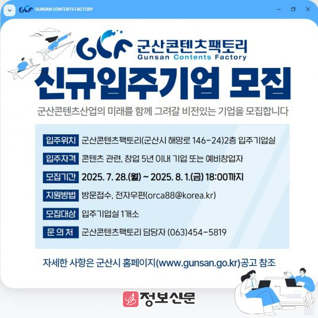 자세한 사항은 군산콘텐츠팩토리 운영지원실(☎063-454-5819)로 문의하면 된다.