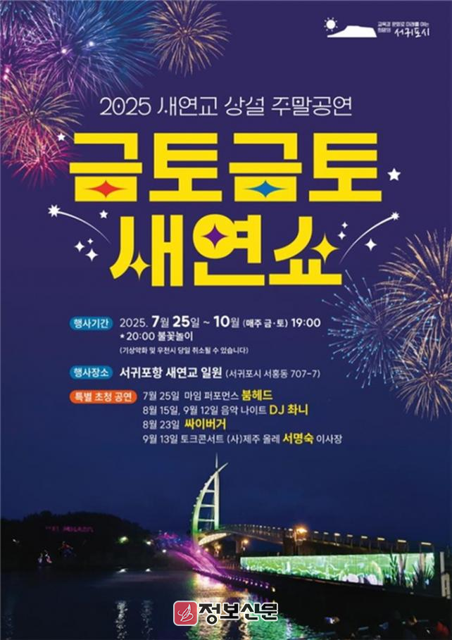 서귀포시 관계자는 “‘금토금토 새연쇼’는 서귀포를 찾는 관광객들에게 잊지 못할 야간 문화체험과 감동을 선물할 것이며, 지역경제 활성화에도 긍정적인 파급효과를 기대한다”라고 밝혔다. 이어 “기상 상황에 따라 공연 일정이 변경되거나 취소될 수 있으니 방문 전 확인을 부탁드린다”라고 전했다.