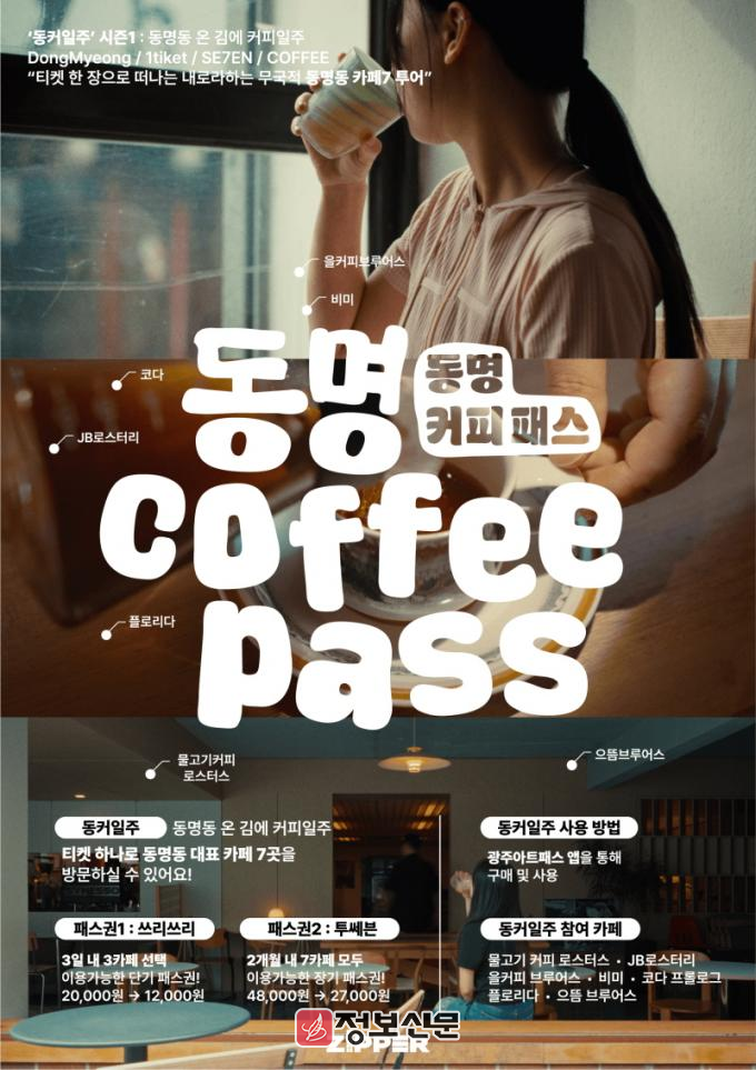 ‘동명 커피패스’는 광주를 찾은 여행객들이 한 장의 티켓으로 동명동의 감성을 담은 7곳의 카페를 여행하듯 자유롭게 방문할 수 있도록 기획된 큐레이션 상품이다. ‘동커일주(동명동 온 김에 커피일주)’라는 부제로 7월 16일부터 9월까지 시즌1이 운영된다.