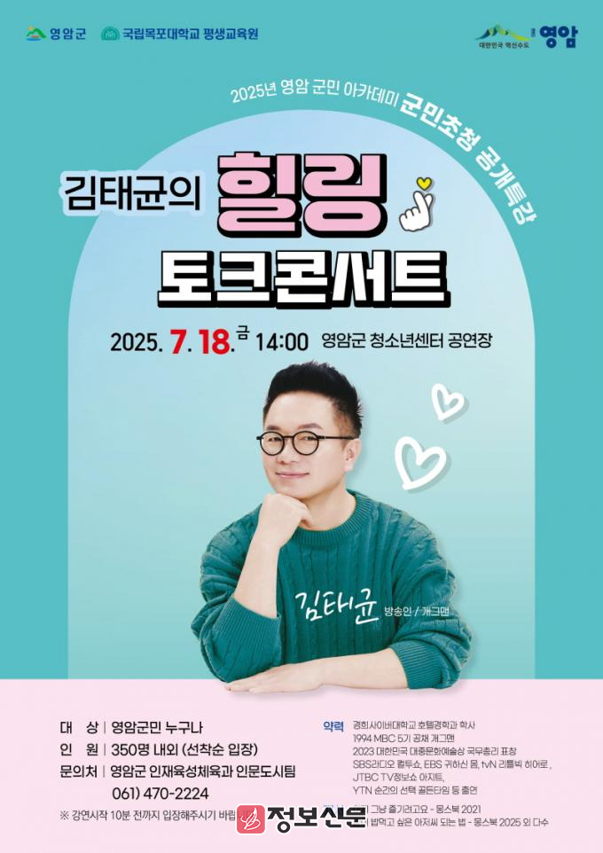 노재영 영암군 인재육성체육과장은 “바쁜 일상에서 잠시나마 마음의 여유를 찾고, 이웃과 공감대를 형성하는 시간을 마련했다. 김태균 씨의 유쾌한 에너지를 공유할 영암군민의 많은 관심과 참여 바란다”고 말했다.