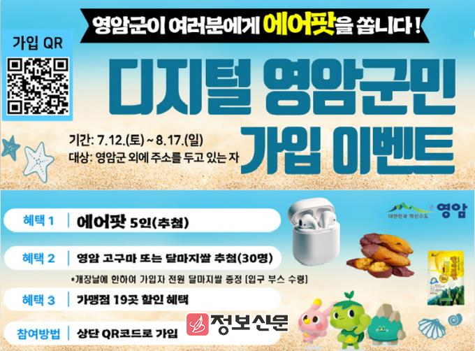 이달 12일 개장해 8/17일까지 운영되는 월출산기찬랜드 개장기간 디지털 영암군민에 가입하면 추첨을 거쳐 푸짐한 선물을 제공한다. 먼저, 5명에게는 무선이어폰을, 30명에게는 영암고구마나 친환경 달마지쌀을 증정한다. 디지털 영암군민 가입자 모두는 음식점·카페·문화시설 등 영암사랑상품권 가맹점 19곳에서 할인혜택도 받을 수 있다.
